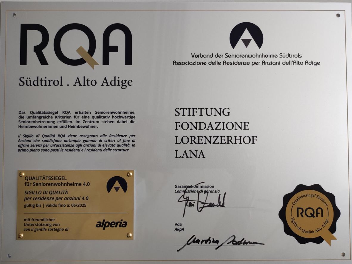 Das Konzept des Qualitätssiegels RQA Südtirol (Relevante Qualitätskriterien in der Altenarbeit) bietet dem Seniorenwohnheim Stiftung Lorenzerhof ÖBPB die Möglichkeit, sich voraussehend und nachhaltig im Sinne einer lernenden Organisation zu entwickeln.