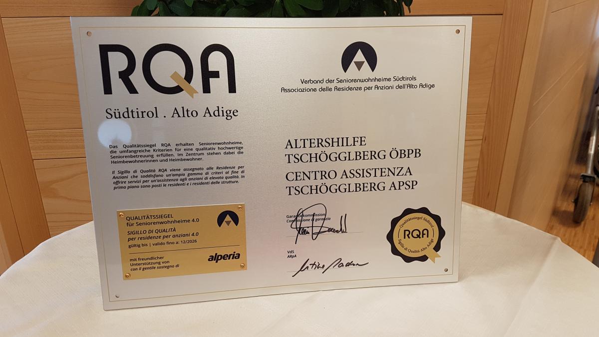 In occasione dell'Assemblea Generale dell'Associazione delle Case di Riposo dell'Alto Adige del 17 aprile 2024, l'APSP Centro Assistenza Tschögglberg è stata insignita del sigillo di qualità RQA per la ricertificazione.