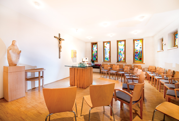 La cappella è consacrata al Beato vescovo Giovanni Nepomuceno de Tschiderer ed è stata realizzata dall’artista Toni Hanny. Lo straordinario altare, con i raffinati arredi sacri, è illuminato da finestre policrome. La nostra cappella ha sempre una porta aperta e invita alla preghiera, alla meditazione e alla devozione.